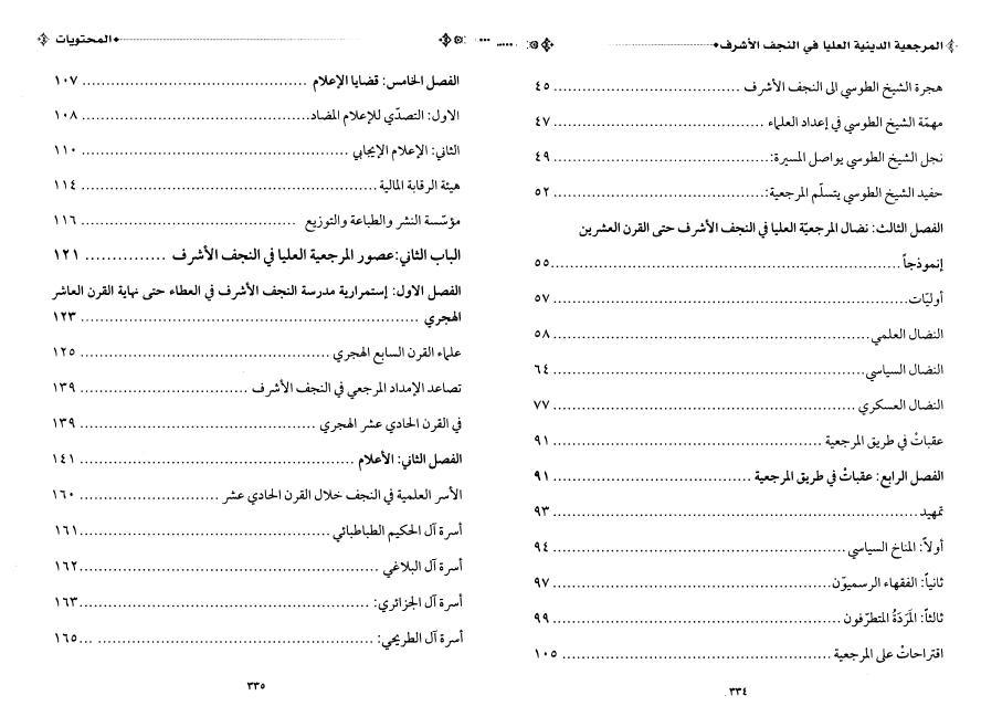 في الفصل الأول (ص 17–19) يوضح المؤلف أن ملامح المرجعية بدأت تتبلور منذ عصر الشيخ الكليني والصدوق والمفيد والطوسي، حيث تحوّلت النجف إلى حاضرة علمية كبرى تمثل محور الفتوى والاجتهاد، ويقول: